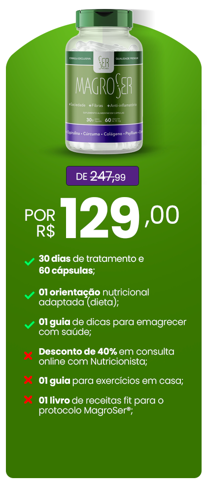 Você já tentou muita coisa para emagrecer, né? Dietas malucas, remédios que afetaram sua saúde, tratamentos caríssimos, treinos exagerados. Agora, com MagroSer® você pode conquistar seu peso ideal em pouco tempo. Seguindo o nosso protocolo exclusivo de emagrecimento acelerado, e com apenas duas cápsulas por dia, você perde peso de modo seguro, saudável e econômico.